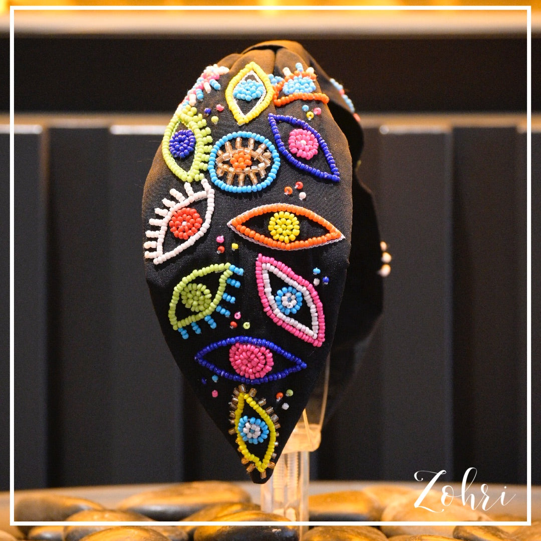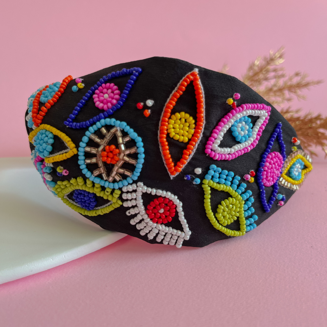 Step up your style game with our Vibrant Visions Hairband! This striking black hairband is meticulously hand-beaded with colorful evil eye patterns, each bead creating a bold, eye-catching design. Perfect for adding a unique, artsy flair to any outfit, this hairband is sure to make heads turn. Features: Bold & Playful Design: A mix of bright colors and intricate beadwork that brings life to your look. Protection & Style: Inspired by the protective evil eye, this piece combines style with meaning. Comfortable & Versatile: Soft, comfortable, and suited for both casual and dressed-up occasions. Express your unique style and keep...